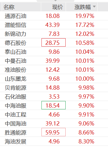 油气股集体强势走高,通源石油、中海油服、中曼石油、准油股份、石化油服、贝肯能源等多股一字涨停,潜能恒信、新锦动力等高开超10%。港股油气股大涨,中港石油飙升50%,山东墨龙涨超37%。