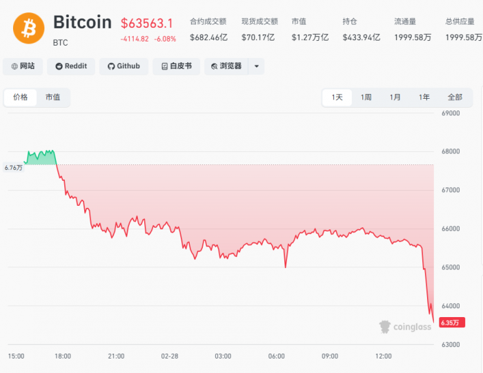 2月28日下午,受以色列袭击伊朗消息影响,比特币急跌,四小时内跌近3%,截至14:52,24小时内跌超6%,跌破64000美元。以太币跌8.49%,索尔币跌近10%。狗狗币、HYPE等多个品种同步重挫。根据CoinGlass数据统计,最近24小时,全球共有13.5万人被爆仓 ,爆仓总金额为4.46亿美元。