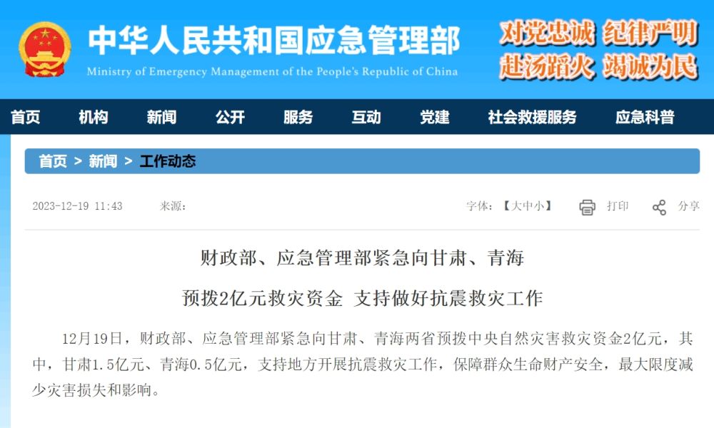 12月19日凌晨,国家防灾减灾救灾委员会、应急管理部针对甘肃省临夏州积石山县6.2级地震灾害,启动国家Ⅳ级救灾应急响应,派出工作组赴灾区实地查看灾情,指导和协助地方做好受灾群众生活救助等救灾工作。
