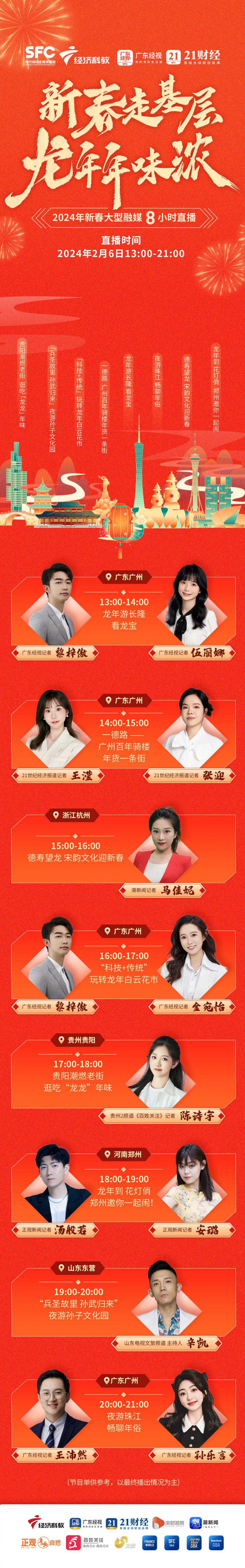 为迎接2024龙年到来,向海内外朋友展示全国各地丰富多彩的年俗文化,搜罗过年吃喝玩乐“一条龙”攻略。广东经济科教频道发起《新春走基层 龙年年味浓 ——2024 年新春大型融媒 8 小时直播》,本次直播将联合 21 财经客户端、潮新闻、正观新闻、百姓关注以及山东文旅频道同步直播。八路记者分别在广州、郑州、杭州、贵阳以及山东等地,深入探寻各地特色年俗、民间艺术表演和传统美食制作。8 小时融媒大型直播将为您呈现一场年味十足的文化盛宴,让您无论身在何处,都能感受到浓浓的中国年味儿!