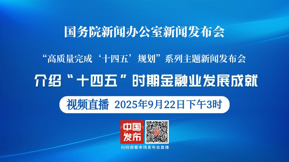 国务院新闻办公室于2025年9月22日(星期一)下午3时举行“高质量完成‘十四五’规划”系列主题新闻发布会,请中国人民银行行长潘功胜,金融监管总局局长李云泽,中国证监会主席吴清,中国人民银行副行长、国家外汇局局长朱鹤新介绍“十四五”时期金融业发展成就,并答记者问。