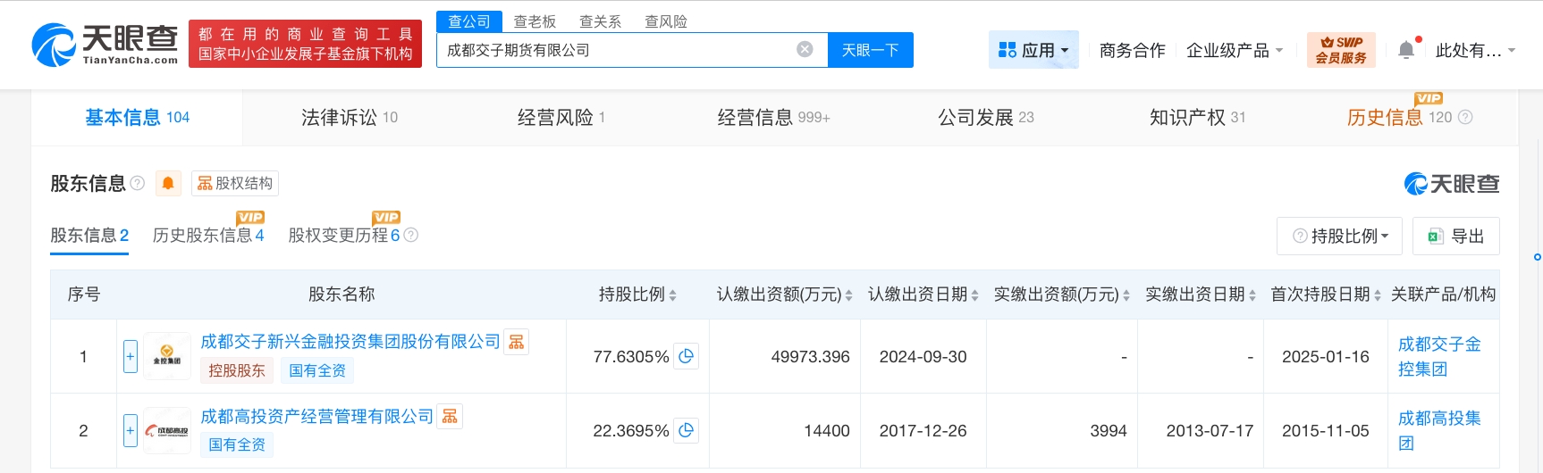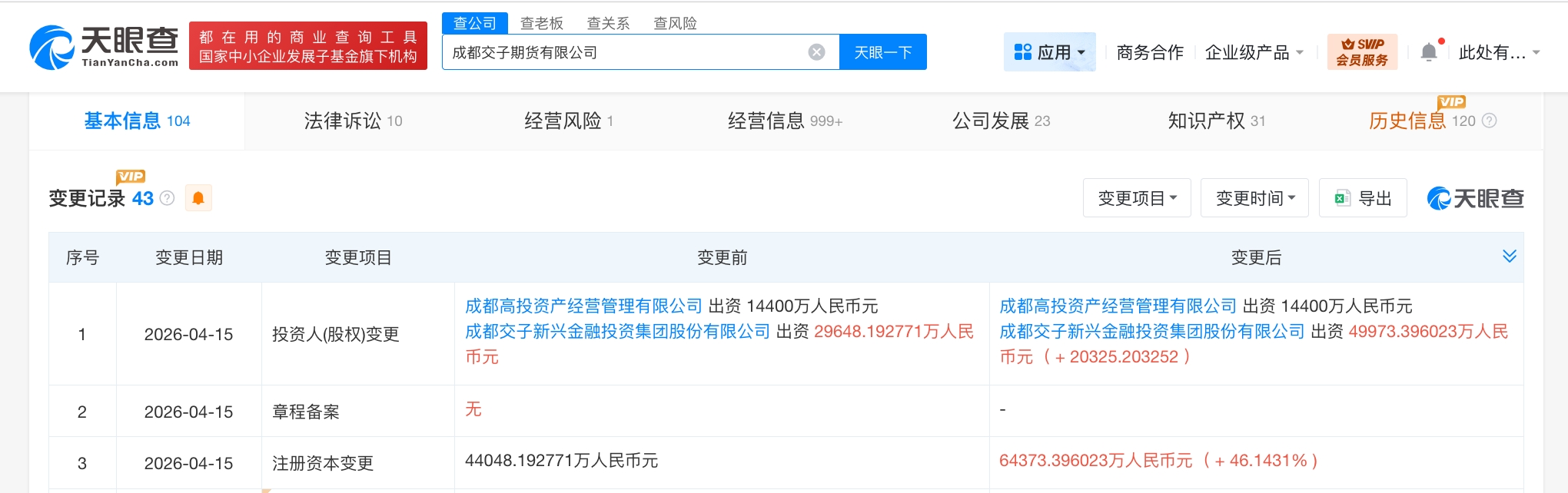 南方财经4月22日电,天眼查App显示,近日,成都交子期货有限公司发生工商变更,注册资本由约4.4亿人民币增至约6.4亿人民币,增幅约46%。该公司成立于1993年2月,法定代表人为杨飞,经营范围为商品期货经纪、金融期货经纪、期货投资咨询。股东信息显示,该公司由成都交子新兴金融投资集团股份有限公司、成都高投资产经营管理有限公司共同持股。