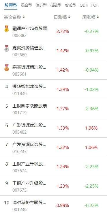 南方财经3月26日电,根据南财基金通数据:2024年3月25日当日收益靠前的股票型基金包括:融通产业趋势股票型证券投资基金(008382,日收益2.72%);嘉实资源精选股票型发起式证券投资基金(005660,日收益1.42%);银华智能建造股票型发起式证券投资基金(011836,日收益1.39%)等。收益较低的股票型基金包括:招商体育文化休闲股票型证券投资基金(001628,日收益-5.02%),建信电子行业股票型证券投资基金(017747,日收益-4.51%);金鹰科技创新股票型证券投资基金(019093,日收益-4.23%)等。