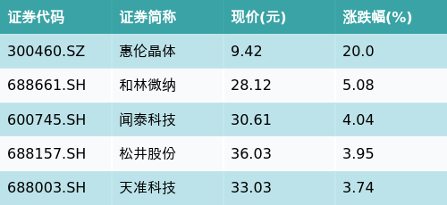 截至收盘,苹果概念主题涨跌幅最高的五只股票为:惠伦晶体(300460.SZ)、和林微纳(688661.SH)、闻泰科技(600745.SH)、松井股份(688157.SH)与天准科技(688003.SH)。详情见下表: