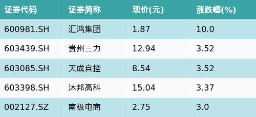 截至收盘,三孩概念主题涨跌幅最高的五只股票为:汇鸿集团(600981.SH)、贵州三力(603439.SH)、天成自控(603085.SH)、沐邦高科(603398.SH)与南极电商(002127.SZ)。详情见下表: