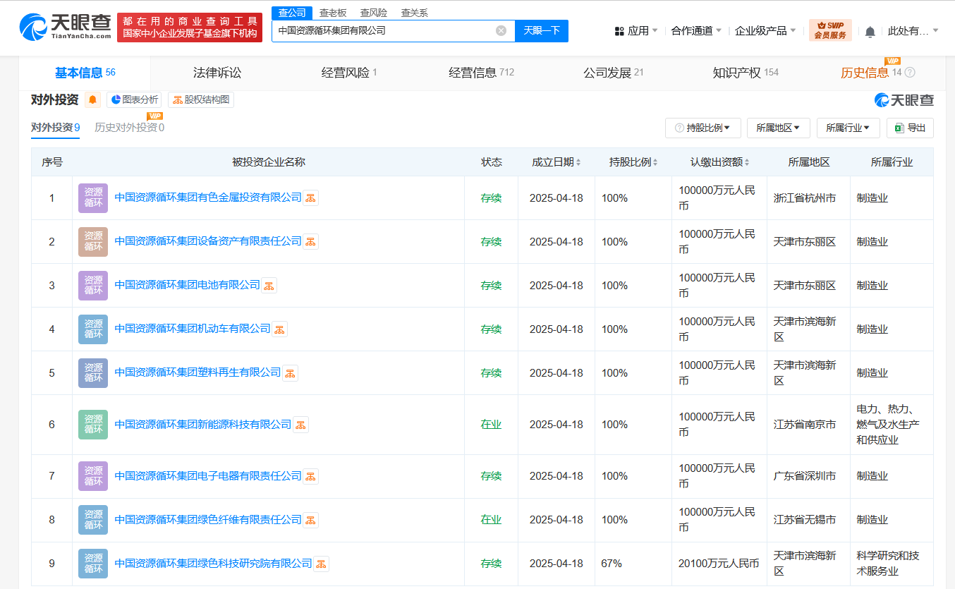 南方财经4月21日电,天眼查App显示,近日,中国资源循环集团有色金属投资有限公司、中国资源循环集团设备资产有限责任公司、中国资源循环集团电池有限公司、中国资源循环集团机动车有限公司、中国资源循环集团塑料再生有限公司、中国资源循环集团新能源科技有限公司、中国资源循环集团电子电器有限责任公司、中国资源循环集团绿色纤维有限责任公司、中国资源循环集团绿色科技研究院有限公司成立,其中,前8家公司注册资本均为10亿人民币,中国资源循环集团绿色科技研究院有限公司注册资本为3亿人民币,上述9家公司控股股东均为中国资源循环集团有限公司。据媒体报道,4月18日,中国资源循环集团宣布成立中国资源循环集团绿色科技研究院有限公司、中国资源循环集团电池有限公司等在内的9家子公司。中国资环集团相关负责人表示,这9家新公司的成立将加快打造全国性、功能性资源回收再利用平台,加快健全绿色低碳循环发展经济体系,全面推进美丽中国建设,为服务经济社会发展提供强大战略性支撑力量。