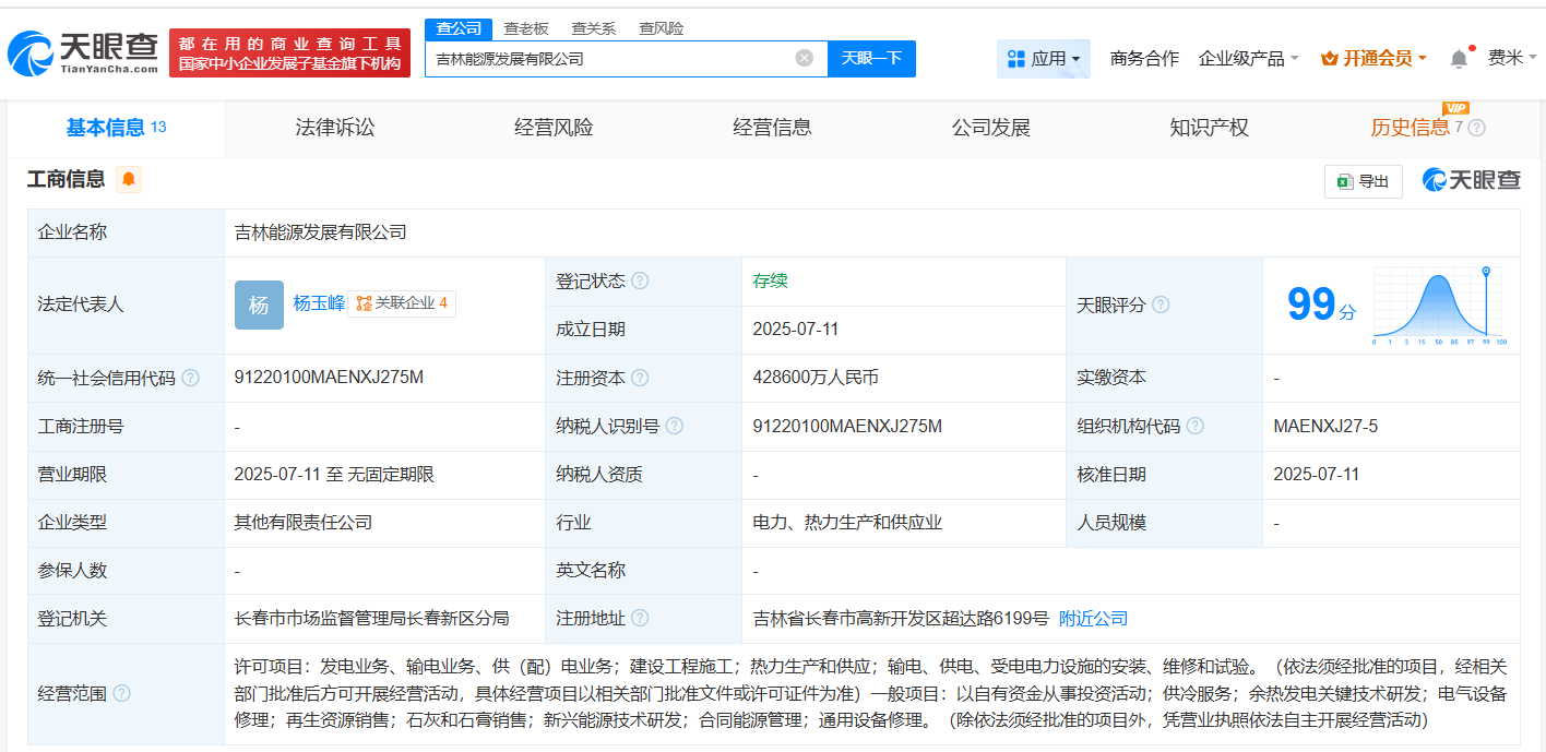 南方财经7月16日电,天眼查App显示,近日,吉林能源发展有限公司成立,法定代表人为杨玉峰,注册资本42.86亿人民币,经营范围包括以自有资金从事投资活动、供冷服务、余热发电关键技术研发、电气设备修理、再生资源销售、石灰和石膏销售等,由国家电投集团吉林能源投资有限公司、吉林省工致科技开发有限公司共同持股。