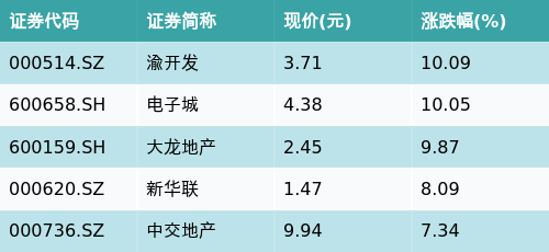 截至午间收盘,房地产开发主题涨跌幅最高的五只股票为:渝开发(000514.SZ)、电子城(600658.SH)、大龙地产(600159.SH)、新华联(000620.SZ)与中交地产(000736.SZ)。详情见下表: