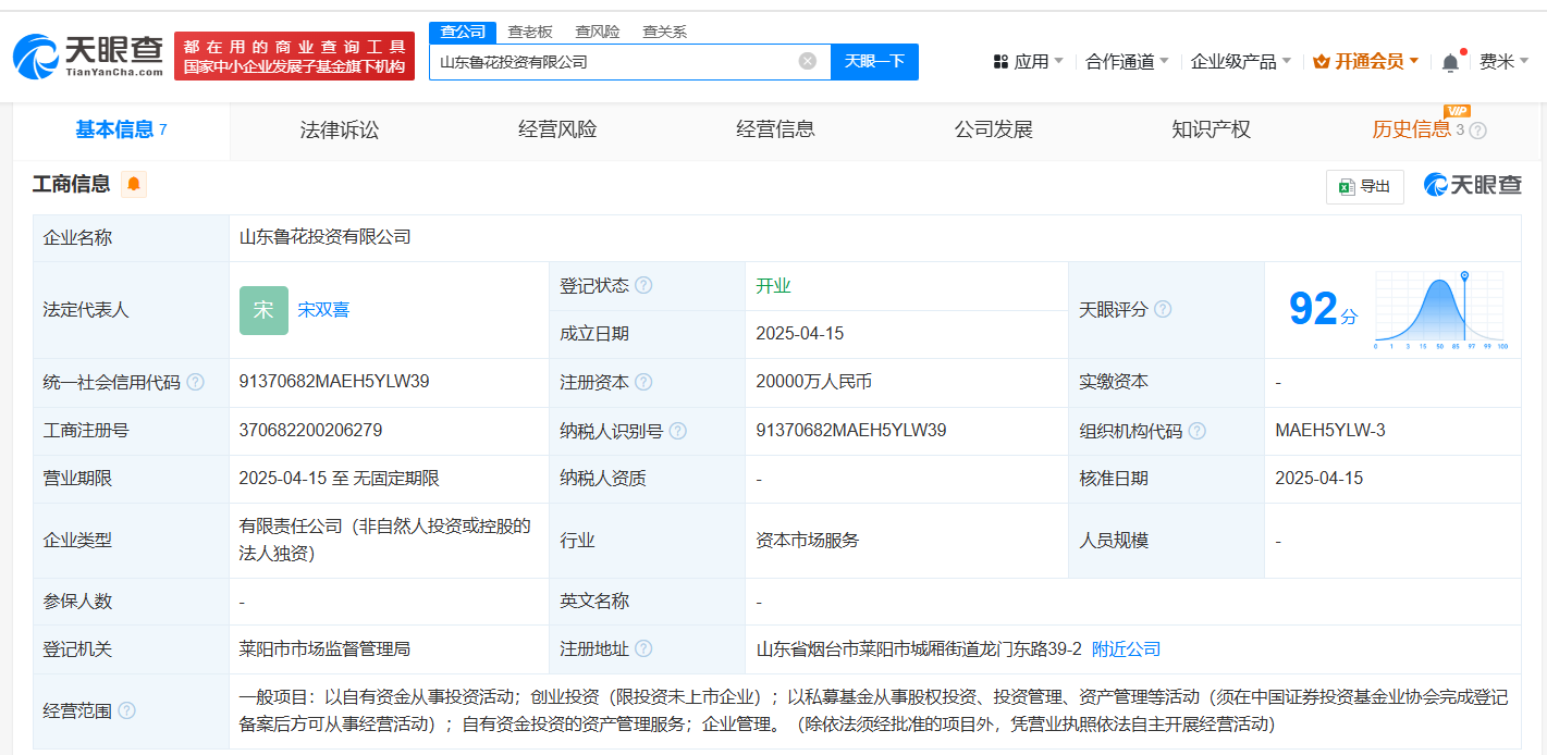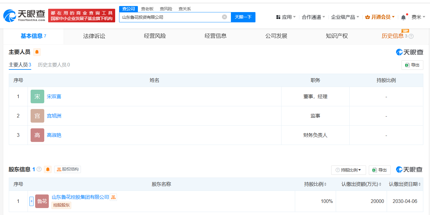 南方财经4月17日电,天眼查App显示,近日,山东鲁花投资有限公司成立,法定代表人为宋双喜,注册资本2亿人民币,经营范围包括以自有资金从事投资活动、创业投资、企业管理等,由山东鲁花控股集团有限公司全资持股。最终受益人信息显示,该公司实际控制人为孙孟全。公开资料显示,孙孟全为山东鲁花集团创始人。