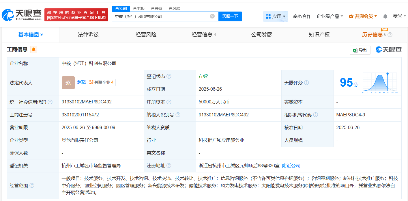 中核集团、杭州科创集团在浙江成立新公司