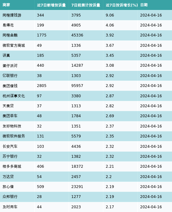 黑猫投诉:同程提钱游、易得花和同程金融近7日投诉增长率最高(4月10日-4月16日)