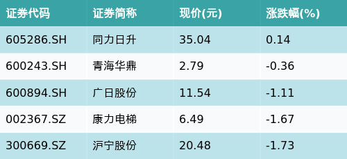 截至收盘,电梯主题涨跌幅最高的五只股票为:同力日升(605286.SH)、青海华鼎(600243.SH)、广日股份(600894.SH)、康力电梯(002367.SZ)与沪宁股份(300669.SZ)。详情见下表: