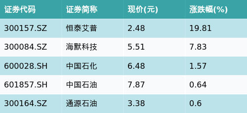 截至午间收盘,可燃冰主题涨跌幅最高的五只股票为:恒泰艾普(300157.SZ)、海默科技(300084.SZ)、中国石化(600028.SH)、中国石油(601857.SH)与通源石油(300164.SZ)。详情见下表: