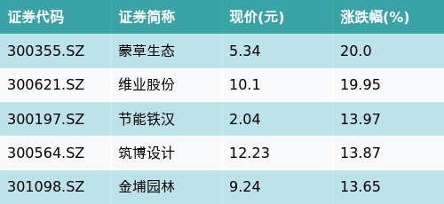截至午间收盘,新型城镇化主题涨跌幅最高的五只股票为:蒙草生态(300355.SZ)、维业股份(300621.SZ)、节能铁汉(300197.SZ)、筑博设计(300564.SZ)与金埔园林(301098.SZ)。详情见下表: