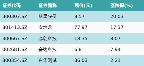 截至收盘,传感器主题涨跌幅最高的五只股票为:慈星股份(300307.SZ)、安培龙(301413.SZ)、必创科技(300667.SZ)、奋达科技(002681.SZ)与东华测试(300354.SZ)。详情见下表: