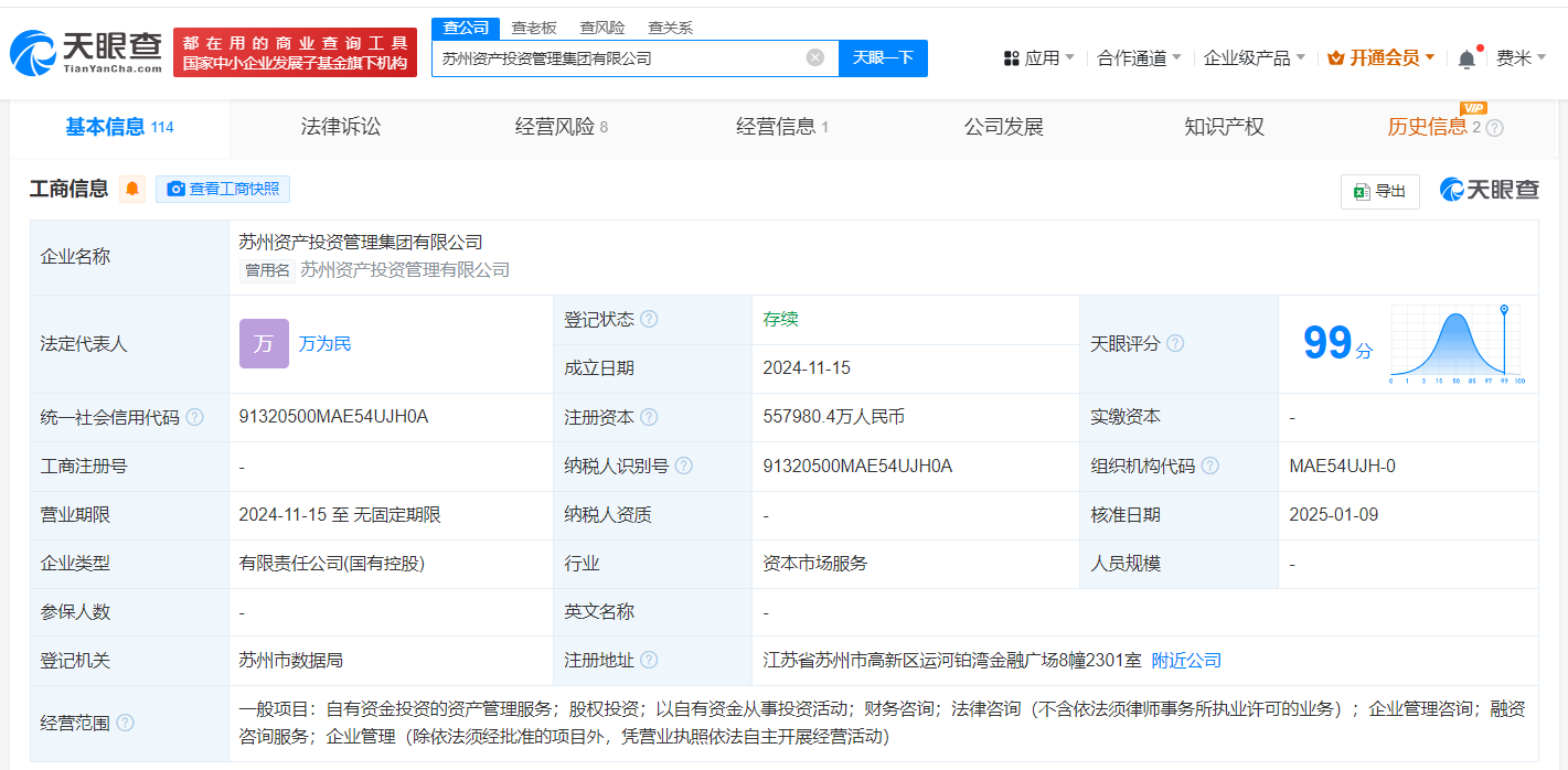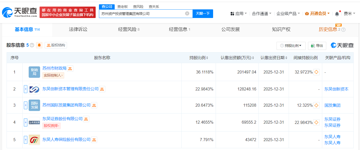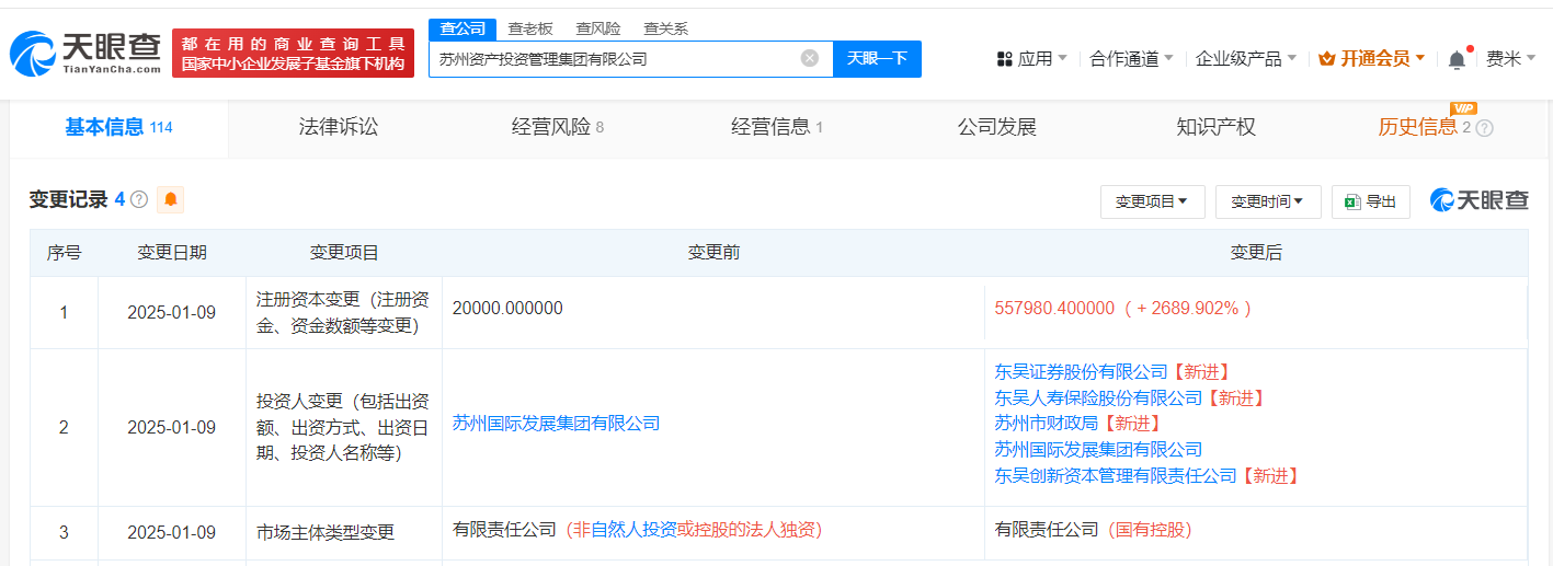 南方财经1月14日电,天眼查App显示,苏州资产投资管理集团有限公司发生工商变更,新增东吴证券(601555)、东吴人寿保险股份有限公司、苏州市财政局、东吴创新资本管理有限责任公司为股东,同时注册资本由2亿人民币增至约55.8亿人民币,增幅约2690%。苏州资产投资管理集团有限公司成立于去年11月,法定代表人为万为民,经营范围含自有资金投资的资产管理服务、股权投资、以自有资金从事投资活动等,现由苏州国际发展集团有限公司及上述新增股东共同持股。