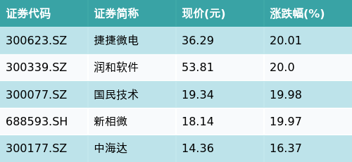 截至午间收盘,芯片概念主题涨跌幅最高的五只股票为:捷捷微电(300623.SZ)、润和软件(300339.SZ)、国民技术(300077.SZ)、新相微(688593.SH)与中海达(300177.SZ)。详情见下表:
