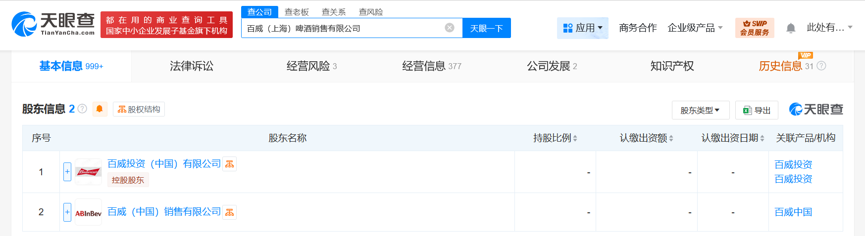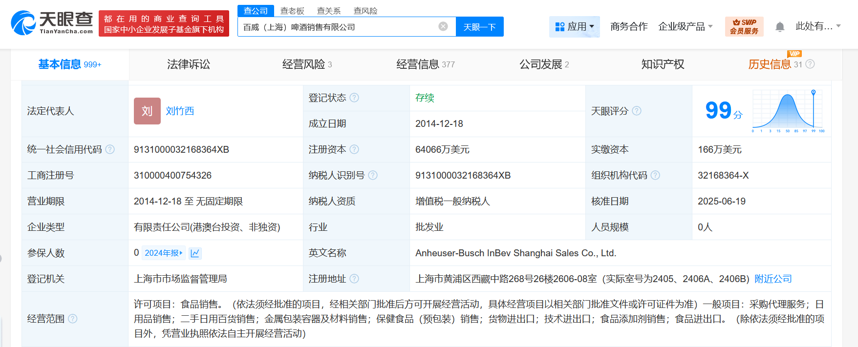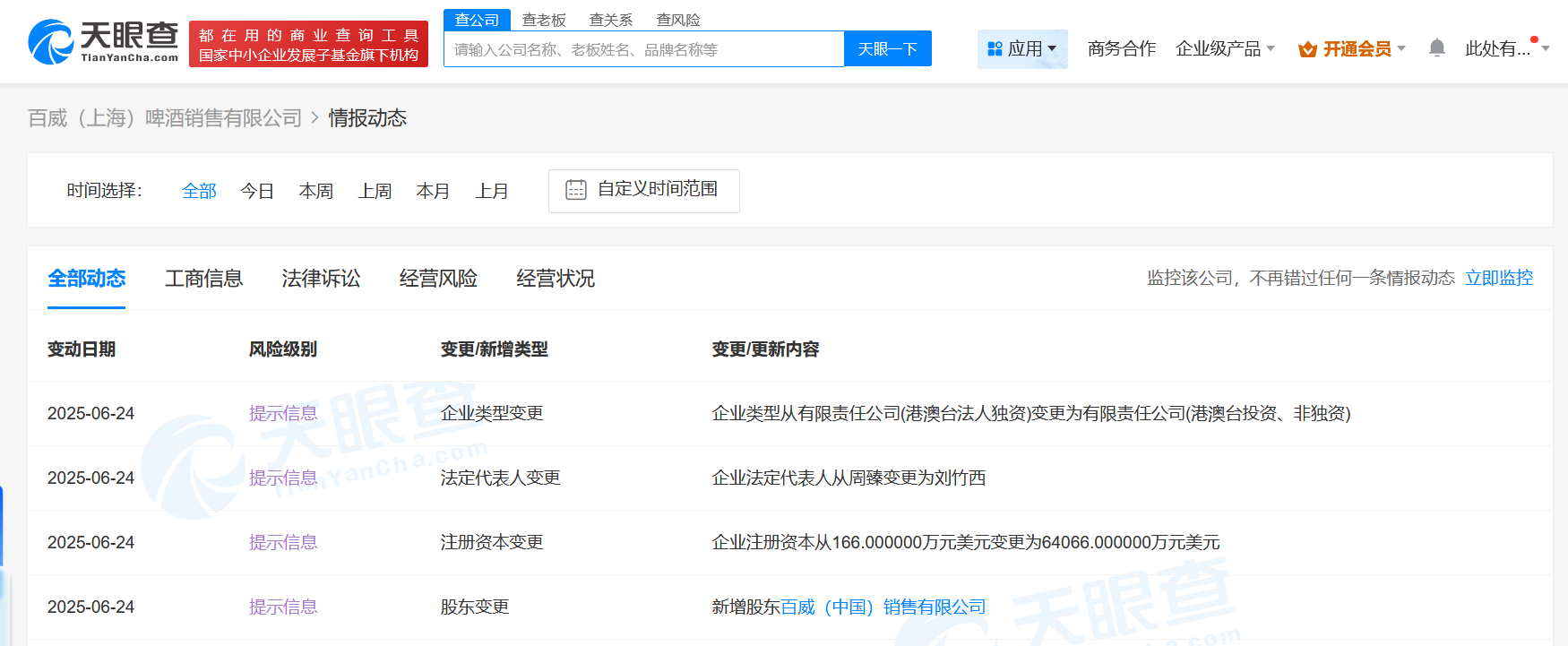 南方财经6月24日电,天眼查App显示,近日,百威(上海)啤酒销售有限公司发生工商变更,新增百威(中国)销售有限公司为股东,注册资本由166万美元增至约6.4亿美元,增幅约38494%,同时,法定代表人由周臻变更为刘竹西。百威(上海)啤酒销售有限公司成立于2014年12月,经营范围含食品销售、采购代理服务、日用品销售、二手日用百货销售、金属包装容器及材料销售、保健食品销售等,现由百威(中国)销售有限公司、百威投资(中国)有限公司共同持股。