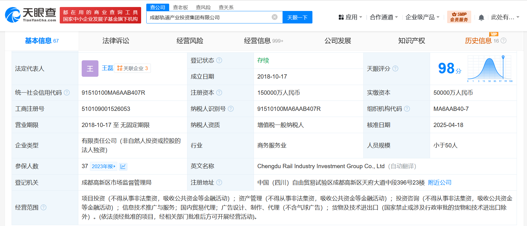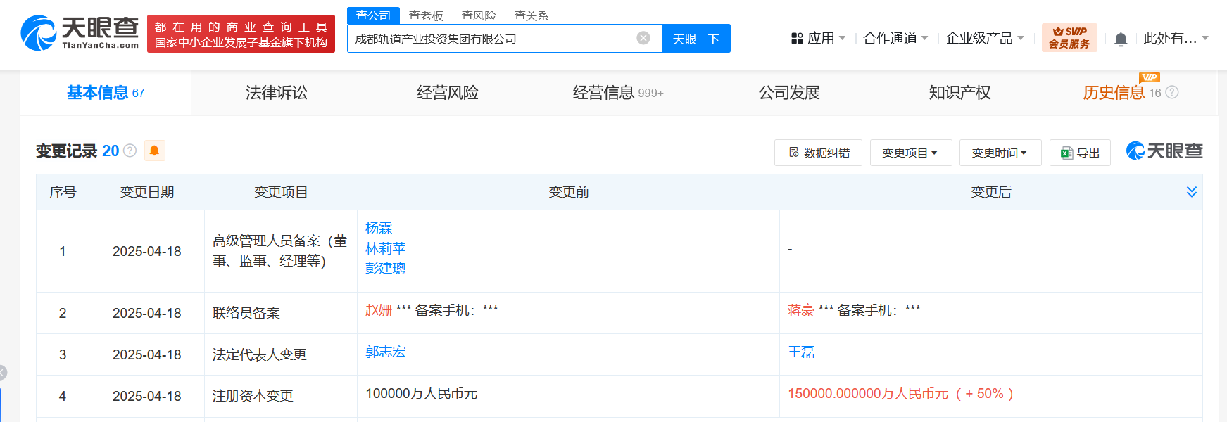 南方财经4月23日电,天眼查App显示,近日,成都轨道产业投资集团有限公司发生工商变更,注册资本由10亿人民币增至15亿人民币,增幅50%,同时,多位主要人员也发生变更。该公司成立于2018年10月,法定代表人为王磊,经营范围为项目投资,资产管理,投资咨询,信息技术推广与服务,国内贸易代理,广告设计、制作、代理,货物及技术进出口,由成都轨道交通集团有限公司全资持股。