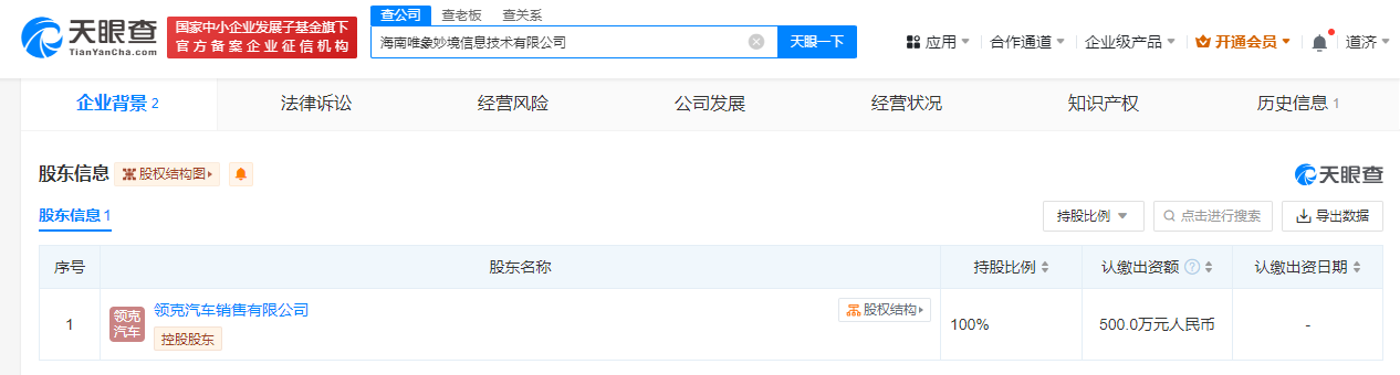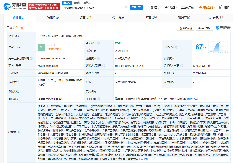 南方财经4月30日电,天眼查App显示,近日,三亚领克新能源汽车销售服务有限公司成立,法定代表人为朱其谦,注册资本500万人民币,经营范围含新能源汽车整车销售、大数据服务、汽车零配件零售、二手车经纪、机动车鉴定评估、智能车载设备销售等。股东信息显示,该公司由领克汽车销售有限公司全资持股。