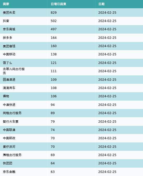 黑猫投诉:美团外卖、抖音和京东商城2月25日新增投诉回复829起、502起和497起