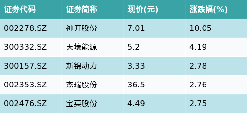 截至收盘,页岩气主题涨跌幅最高的五只股票为:神开股份(002278.SZ)、天壕能源(300332.SZ)、新锦动力(300157.SZ)、杰瑞股份(002353.SZ)与宝莫股份(002476.SZ)。详情见下表: