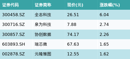 截至收盘,智能音箱主题涨跌幅最高的五只股票为:全志科技(300458.SZ)、泉为科技(300716.SZ)、协创数据(300857.SZ)、瑞芯微(603893.SH)与元隆雅图(002878.SZ)。详情见下表: