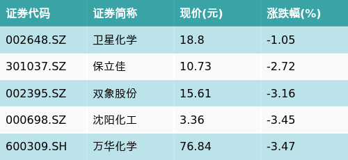 截至收盘,丙烯酸主题涨跌幅最高的五只股票为:卫星化学(002648.SZ)、保立佳(301037.SZ)、双象股份(002395.SZ)、沈阳化工(000698.SZ)与万华化学(600309.SH)。详情见下表: