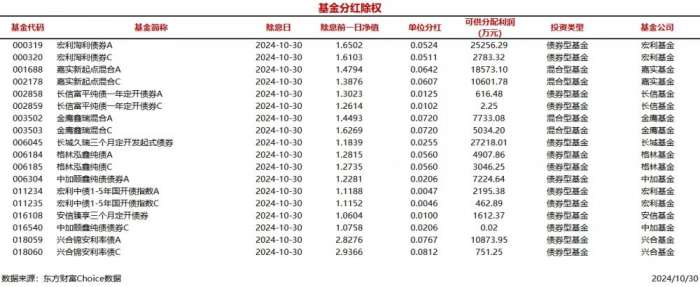南方财经10月30日电,据东方财富Choice数据统计,今日共有18只基金分红除权(A/C类分开计算),包括14只债券型基金、4只混合型基金,累计可供分配利润12.89亿元。