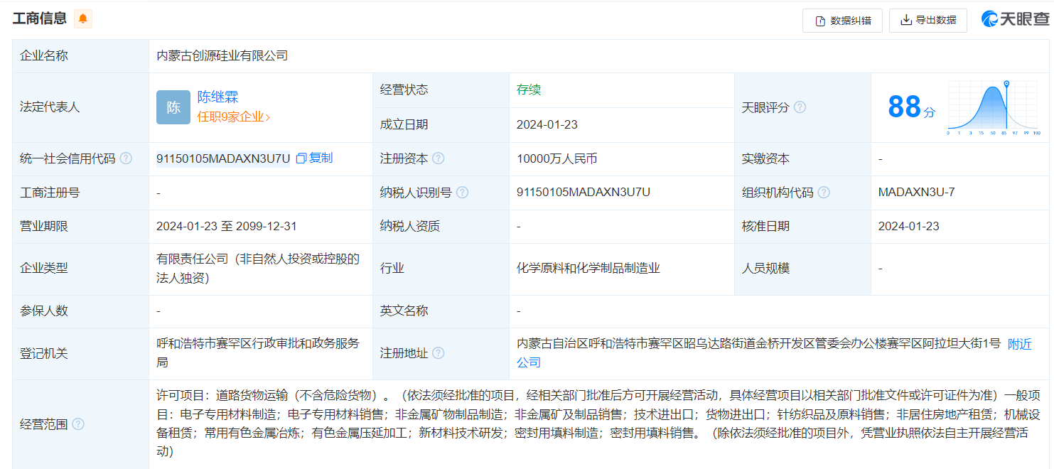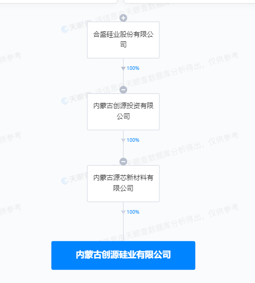 南方财经2月22日电,天眼查App显示,近日,内蒙古创源硅业有限公司成立,法定代表人为陈继霖,注册资本1亿人民币,经营范围含电子专用材料制造、销售,非金属矿物制品制造、销售,非居住房地产租赁,机械设备租赁,常用有色金属冶炼等。股权全景穿透图显示,该公司由内蒙古源芯新材料有限公司全资持股,后者由合盛硅业(603260)间接全资持股。
