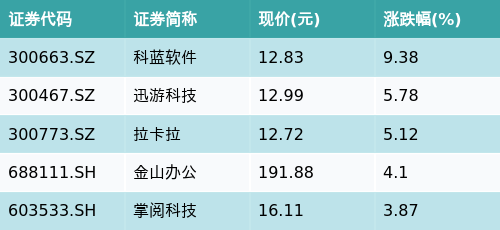 截至收盘,华为HMS主题涨跌幅最高的五只股票为:科蓝软件(300663.SZ)、迅游科技(300467.SZ)、拉卡拉(300773.SZ)、金山办公(688111.SH)与掌阅科技(603533.SH)。详情见下表:
