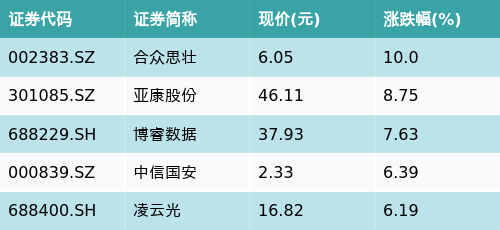 截至收盘,北京主题涨跌幅最高的五只股票为:合众思壮(002383.SZ)、亚康股份(301085.SZ)、博睿数据(688229.SH)、中信国安(000839.SZ)与凌云光(688400.SH)。详情见下表: