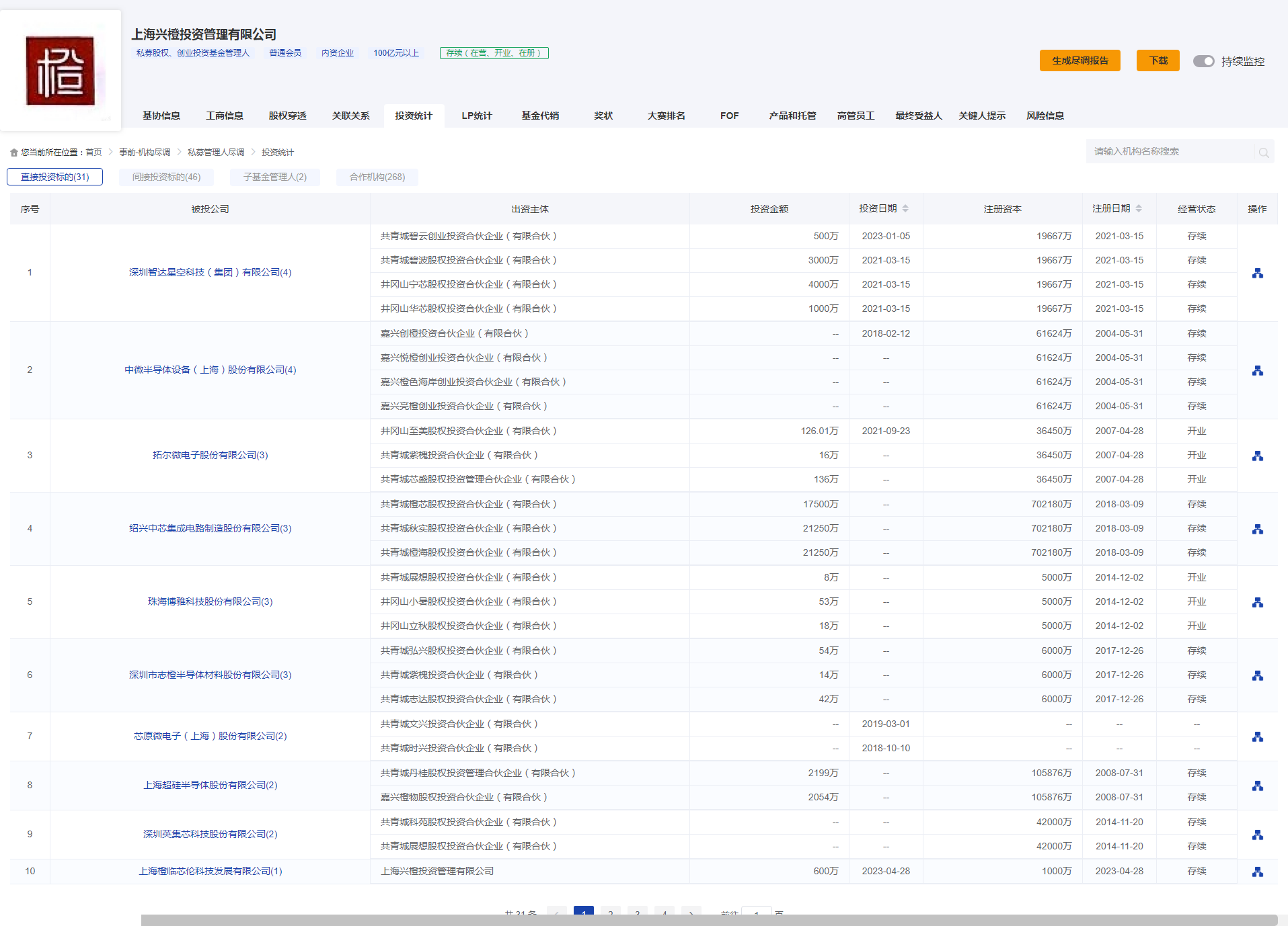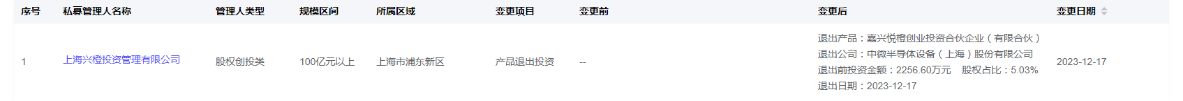 南方财经12月18日电,12月17日,上海兴橙投资管理有限公司发生投资变更,其旗下嘉兴悦橙创业投资合伙企业(有限合伙)产品退出中微半导体设备(上海)股份有限公司,退出前投资金额为2256.60万元,股权占比5.03%。