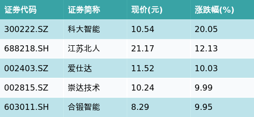截至午间收盘,特斯拉概念主题涨跌幅最高的五只股票为:科大智能(300222.SZ)、江苏北人(688218.SH)、爱仕达(002403.SZ)、崇达技术(002815.SZ)与合锻智能(603011.SH)。详情见下表:
