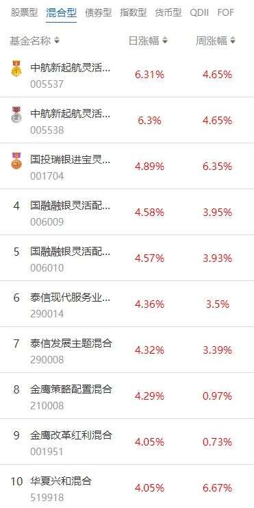 南方财经4月2日电,2024年4月1日当日收益较高的混合型基金包括:中航新起航灵活配置混合型证券投资基金(005538,日收益6.30%);国投瑞银进宝灵活配置混合型证券投资基金(001704,日收益4.89%);国融融银灵活配置混合型证券投资基金(006009,日收益4.58%)等。收益较低的混合型基金包诺:万家宏观择时多策略灵活配置混合型证券投资基金(014569,日收益-2.30%);万家新利灵活配置混合型证券投资基金(519191,日收益-1.32%);招商行业领先混合型证券投资基金(217012,日收益-1.14%)等。