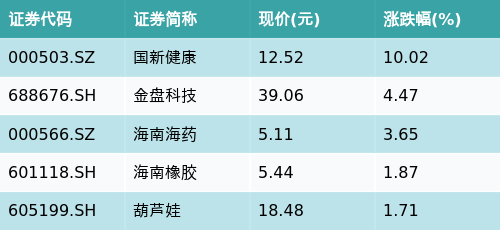截至收盘,海南自贸区主题涨跌幅最高的五只股票为:国新健康(000503.SZ)、金盘科技(688676.SH)、海南海药(000566.SZ)、海南橡胶(601118.SH)与葫芦娃(605199.SH)。详情见下表: