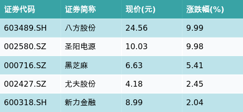 截至收盘,电芯及PACK主题涨跌幅最高的五只股票为:八方股份(603489.SH)、圣阳电源(002580.SZ)、黑芝麻(000716.SZ)、尤夫股份(002427.SZ)与新力金融(600318.SH)。详情见下表: