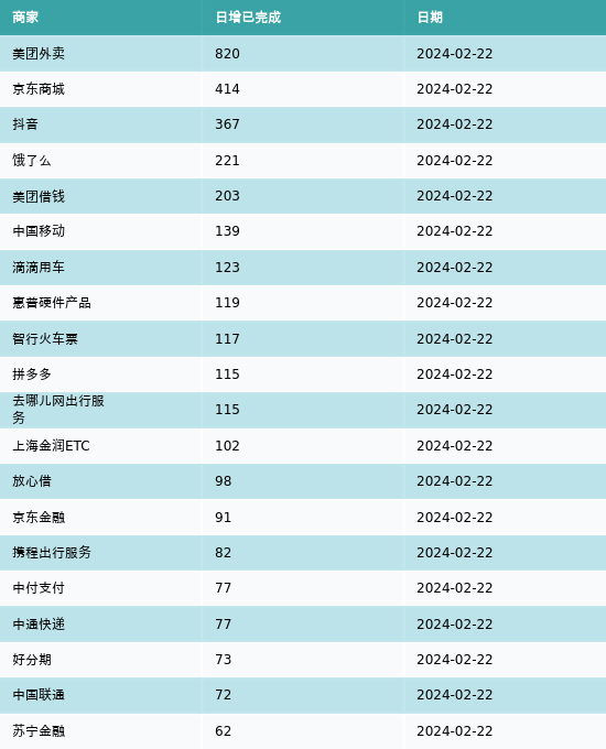 南方财经2月23日电,根据黑猫投诉网站数据显示,2月22日新增投诉完成处理最高前三名的商家分别为:美团外卖、京东商城和抖音,分别增加820起、414起和367起。2月22日新增投诉完成处理前20详情见下表: