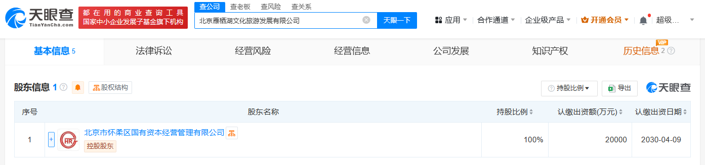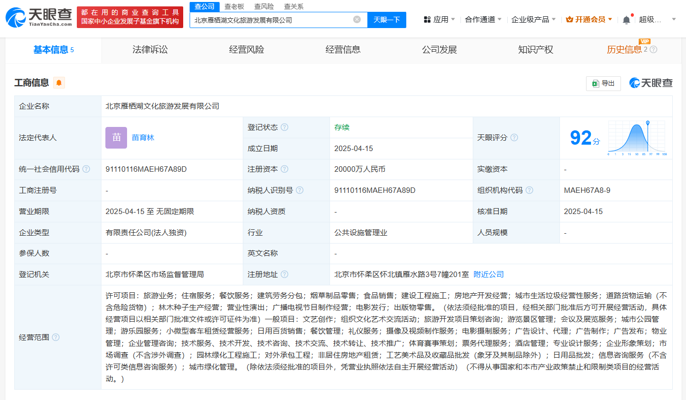 北京雁栖湖文化旅游发展公司成立 注册资本2亿