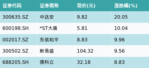 截至午间收盘,5G主题涨跌幅最高的五只股票为:中达安(300635.SZ)、*ST大唐(600198.SH)、东信和平(002017.SZ)、新易盛(300502.SZ)与德科立(688205.SH)。详情见下表: