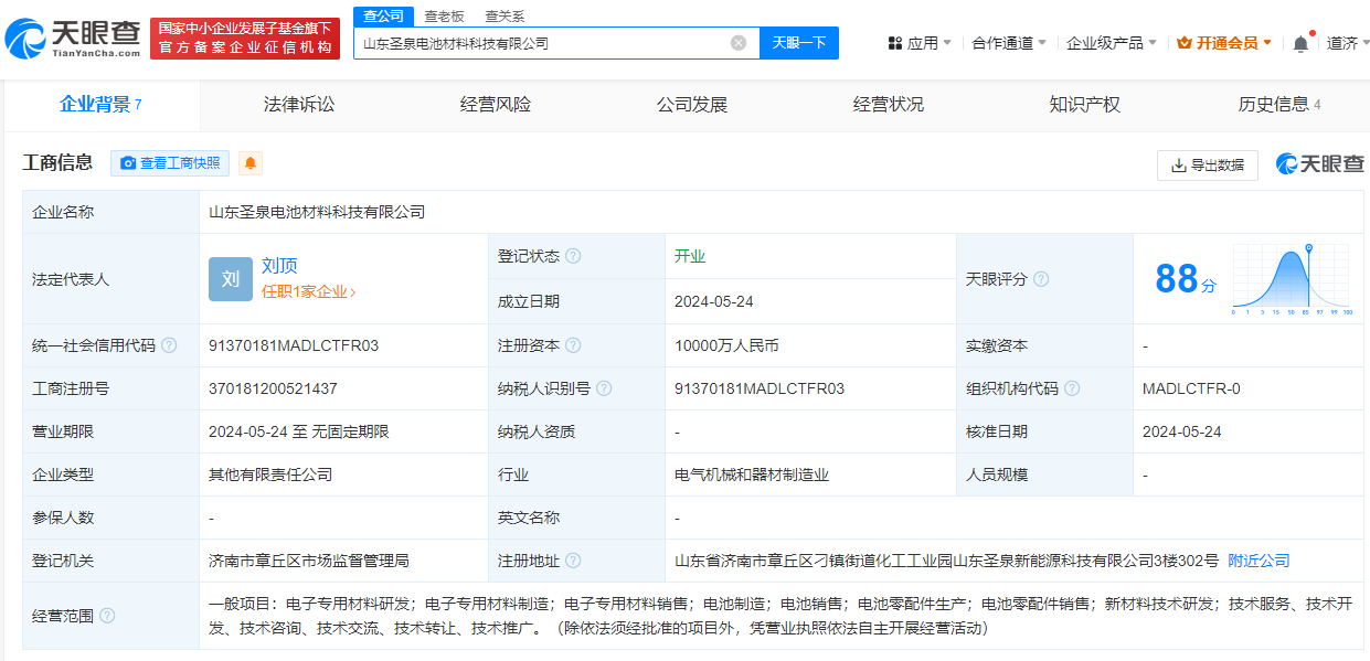 圣泉集团成立电池材料公司 注册资本1亿元