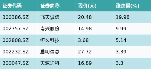 截至收盘,数据安全主题涨跌幅最高的五只股票为:飞天诚信(300386.SZ)、南兴股份(002757.SZ)、恒久科技(002808.SZ)、启明信息(002232.SZ)与天源迪科(300047.SZ)。详情见下表: