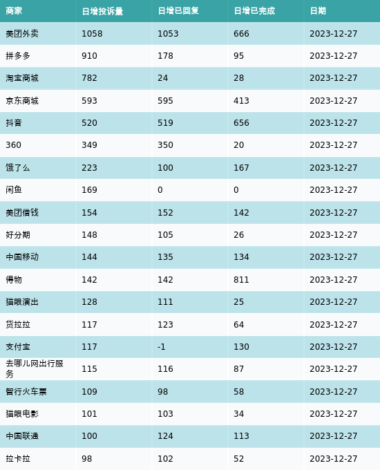 南方财经12月28日电,12月27日黑猫投诉网站数据显示,12月27日单日新增投诉量最高前三名的商家分别为:美团外卖、拼多多和淘宝商城,分别增加1058起、910起和782起。日新增投诉量前20详情见下表: