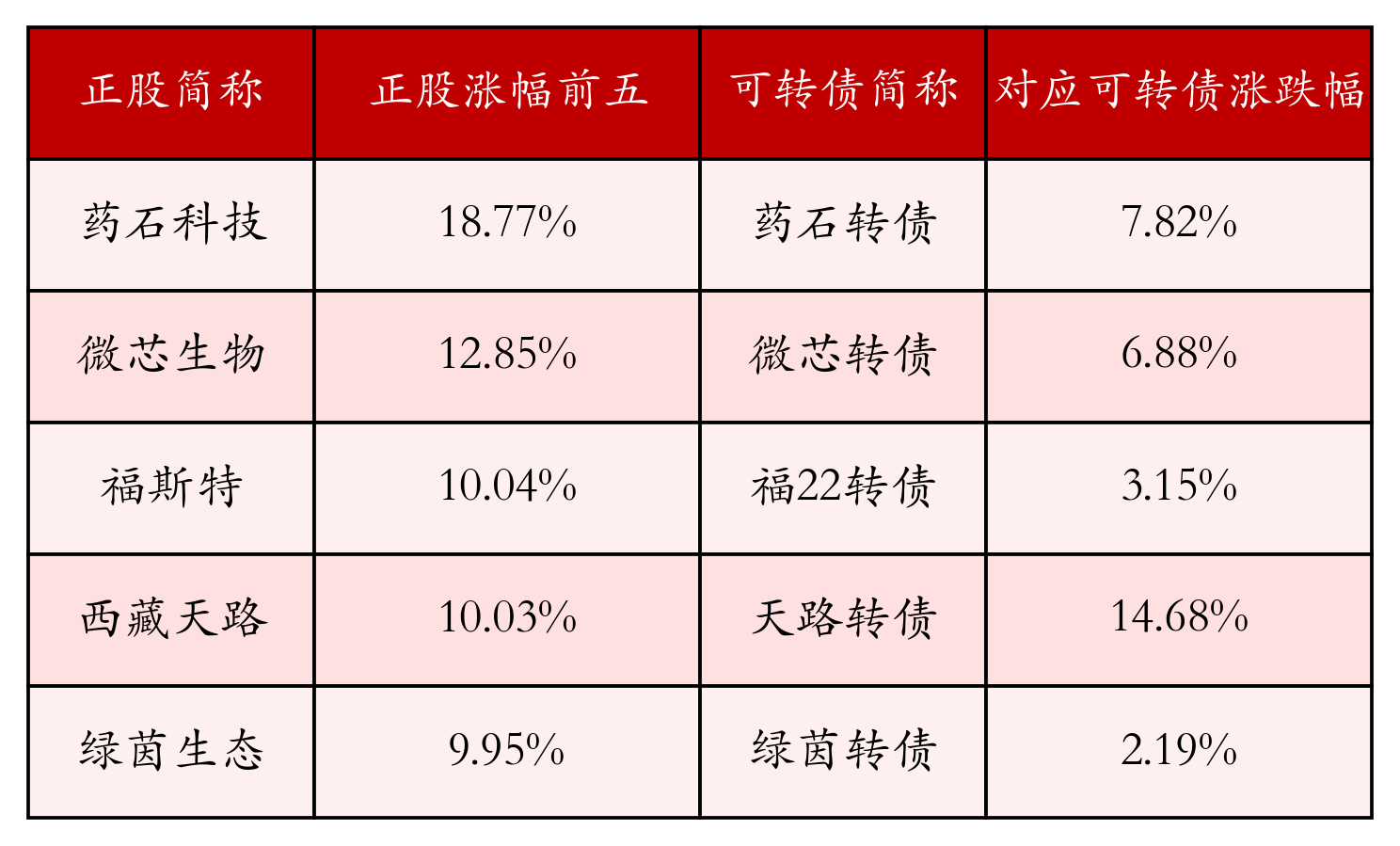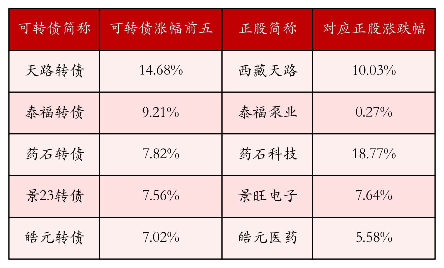 南财智讯7月29日电,南财金融终端盘后数据显示,债市方面,中证转债指数收涨0.14%,报461.0,成交额为783.93亿元。可转债方面,今日共成交461只可转债,其中227只收涨,2只收平,232只收跌。具体来看,40只可转债涨幅超过2%。其中天路转债(110060)涨14.68%,泰福转债(123160)涨9.21%,药石转债(123145)涨7.82%。今日有7只可转债跌幅超2%,通光转债(123034)跌4.15%,博汇转债(123156)跌3.59%,科华转债(128124)跌3.01%。存在交易量的可转债所对应的正股中,200只收涨,17只收平,244只收跌。具体来看,25只可转债对应正股涨幅超过5%,其中,福斯特(603806)涨停,收涨10.04%。同时所对应的可转债:福22转债(113661)同涨3.15%。今日有2只可转债对应正股跌幅超过5%,没有正股跌停。