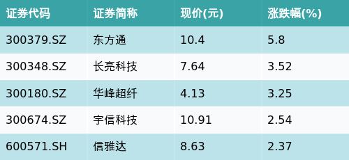 截至收盘,跨境支付(CIPS)主题涨跌幅最高的五只股票为:东方通(300379.SZ)、长亮科技(300348.SZ)、华峰超纤(300180.SZ)、宇信科技(300674.SZ)与信雅达(600571.SH)。详情见下表: