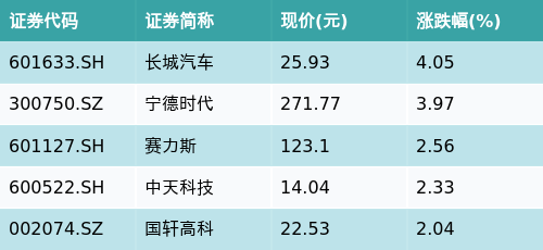 截至午间收盘,固态电池主题涨跌幅最高的五只股票为:长城汽车(601633.SH)、宁德时代(300750.SZ)、赛力斯(601127.SH)、中天科技(600522.SH)与国轩高科(002074.SZ)。详情见下表: