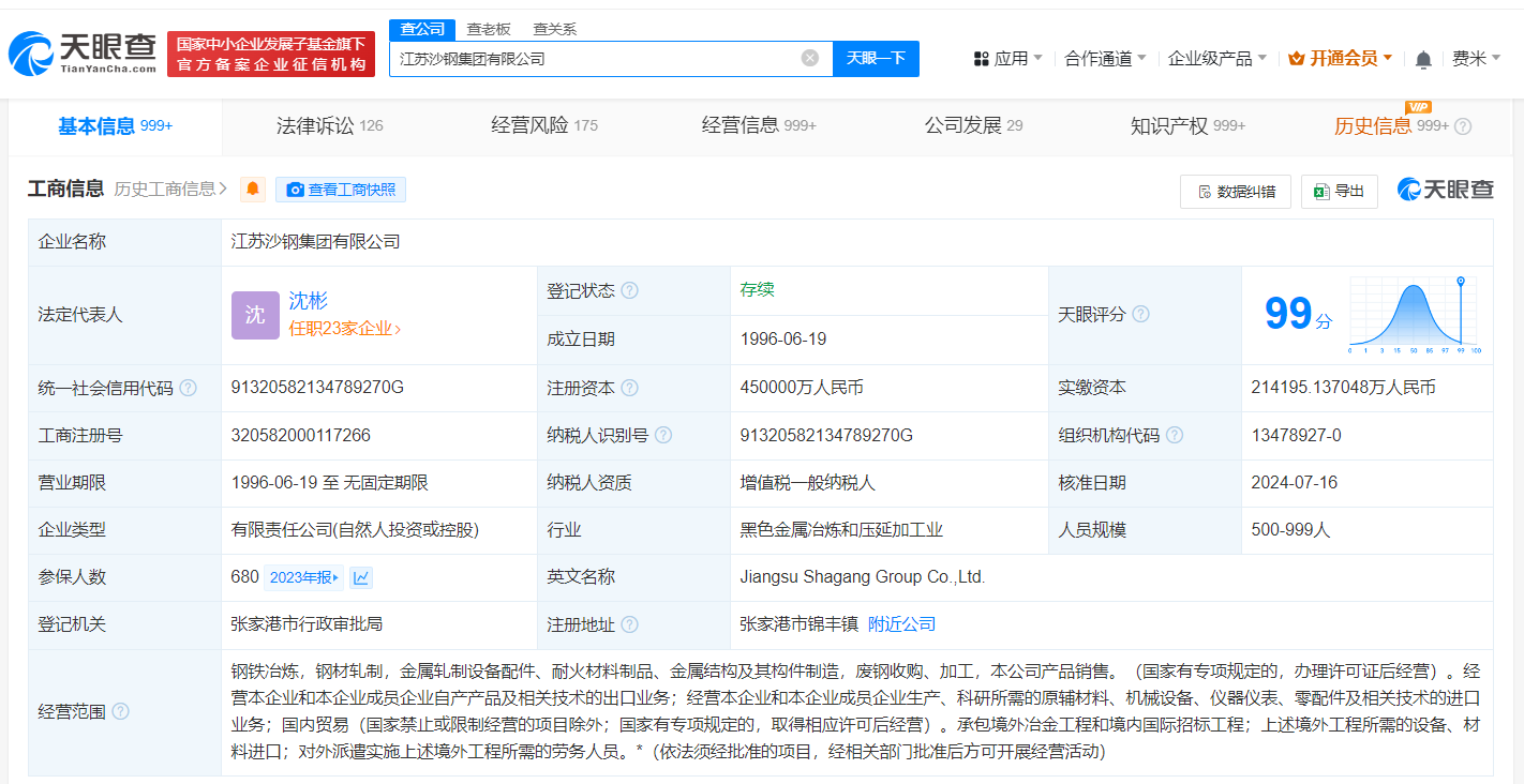 南方财经7月18日电,天眼查App显示,近日,江苏沙钢集团有限公司发生工商变更,沈文荣等退出股东行列,新增沈文荣之子沈彬等为股东。江苏沙钢集团有限公司成立于1996年6月,法定代表人、董事长为沈彬,注册资本45亿人民币。日前,抚顺特钢(600399)、沙钢股份(002075)均发布公告称,沈彬通过沈文荣逝世后的财产分配及转让、遗产继承等方式,取得了沈文荣原持有的沙钢集团、锦程沙洲及润源不锈钢全部股权,目前已成为公司实际控制人。6月30日,沙钢股份、抚顺特钢原实际控制人沈文荣逝世,享年78岁。