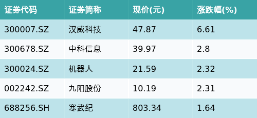 截至午间收盘,脑机接口主题涨跌幅最高的五只股票为:汉威科技(300007.SZ)、中科信息(300678.SZ)、机器人(300024.SZ)、九阳股份(002242.SZ)与寒武纪(688256.SH)。详情见下表: