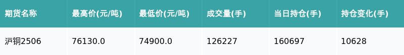南财智讯4月16日电,南财金融终端盘后期货数据显示,上海期货交易所的沪铜主力合约收跌0.92%,收盘报75260.0元/吨,日内资金流入6.37亿元。其他相关指标见下表:
