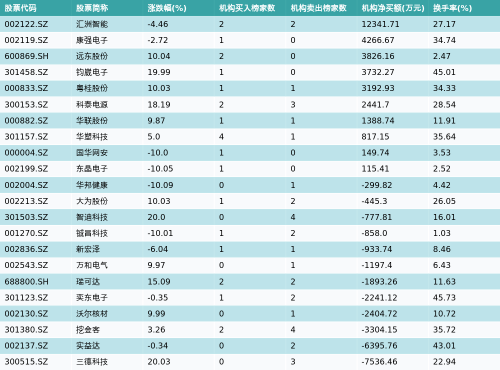 南方财经1月20日电,南财金融终端数据显示,因当日异动登上龙虎榜的个股中,22只沪深A股龙虎榜出现了机构的身影,机构合计净买入3984.94万元,具体来看,机构净买入10只个股,净卖出12只个股。其中,机构净买入前三分别为汇洲智能(002122.SZ)、康强电子(002119.SZ)与远东股份(600869.SH),详情见下图: